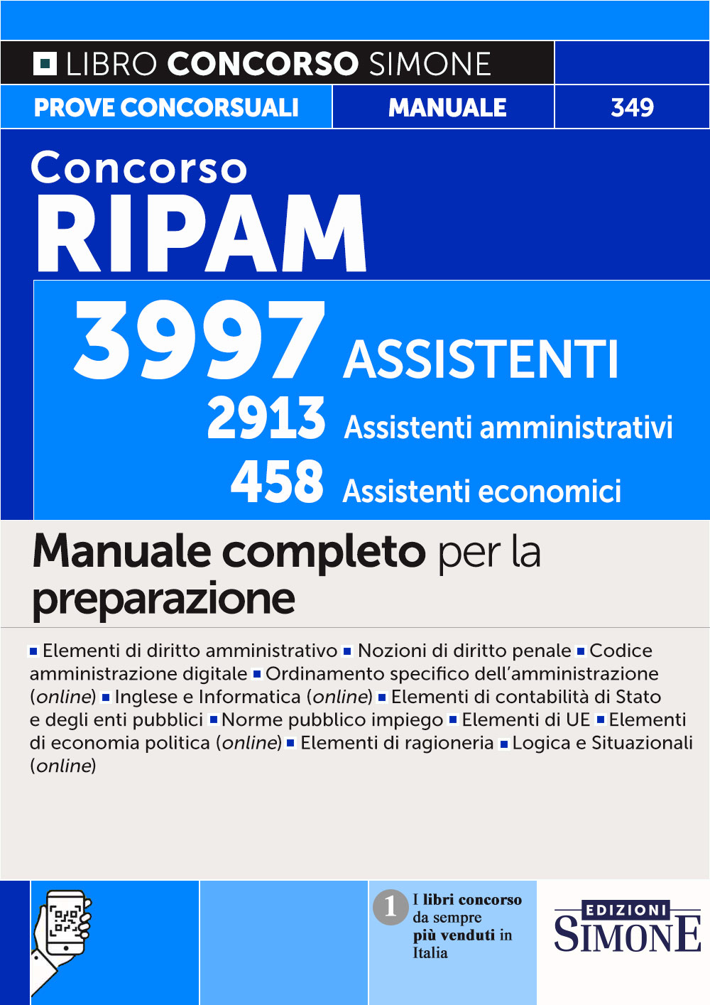 Il manuale RIPAM 3997 Assistenti offre una preparazione completa e aggiornata per la preparazione al concorso, con focus su diritto amministrativo, penale, contabilità, pubblico impiego, UE, logica e situazionali, oltre a inglese e informatica online.